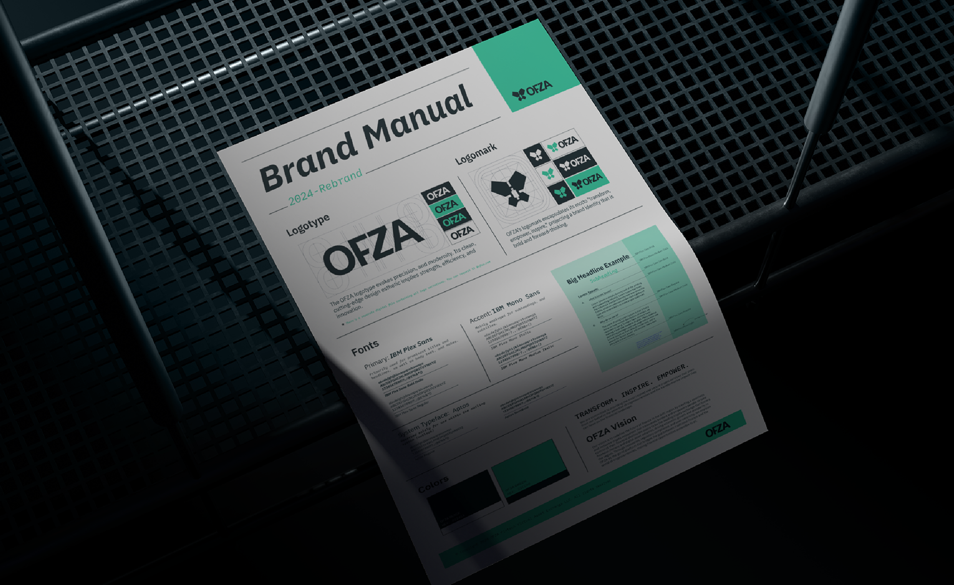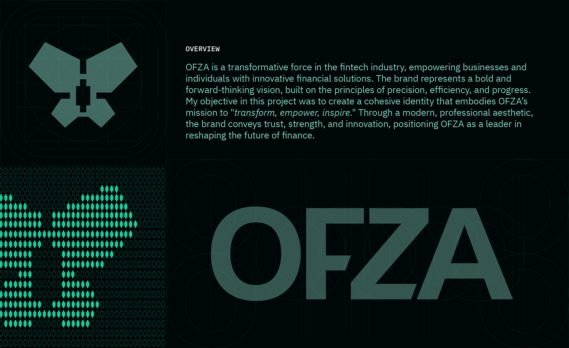 OFZA is a transformative force in the fintech industry, empowering businesses and individuals with innovative financial solutions. The brand represents a bold and forward-thinking vision, built on the principles of precision, efficiency, and progress. My objective in this project was to create a cohesive identity that embodies OFZA’s mission to "transform, empower, inspire." Through a modern, professional aesthetic, the brand conveys trust, strength, and innovation, positioning OFZA as a leader in reshaping the future of finance.